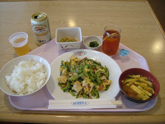 | 上が、お昼の「ゴーヤーチャンプルー定食」。(ビールは別ですよ(^^;)。 ご覧の通り、ボリューム満点です。みそ汁には島豆腐。小鉢はミミガーもです。レモンティーが付いているのも、沖縄っぽくてよかったです。 それよりも、おいしかったです。町の食堂と変わりません!! でも、食堂を利用したのは、乗船した19人のうち…、夜:0/朝:0/昼:2名。(;_;) |