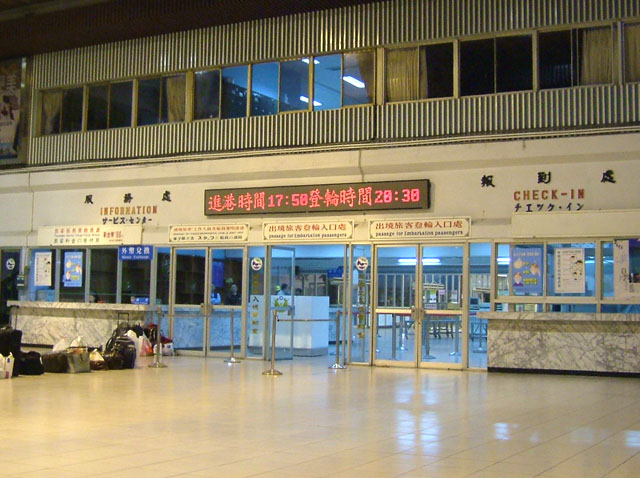 | 入口の左側の「サービス・センター」と書かれた窓口(ってこちらしか開いていない)で、乗船手続きと、港湾使用料等、NT$166を支払います。 #ちなみに、短時間なら、ここで荷物を預けてもOK 20:30をすぎると、出国審査が始まります。 そう、免税店の類が無いのです。 |