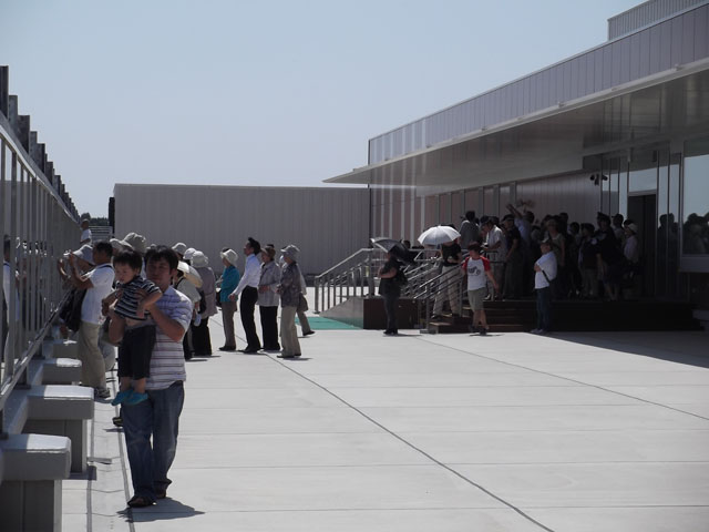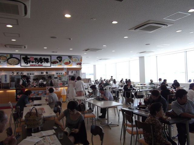 | 2階に上がると、フードコートがあり、午前11時過ぎにもかかわらず、この混雑。展望デッキもこの人だかり(無料ですしね)。 |