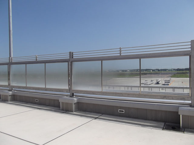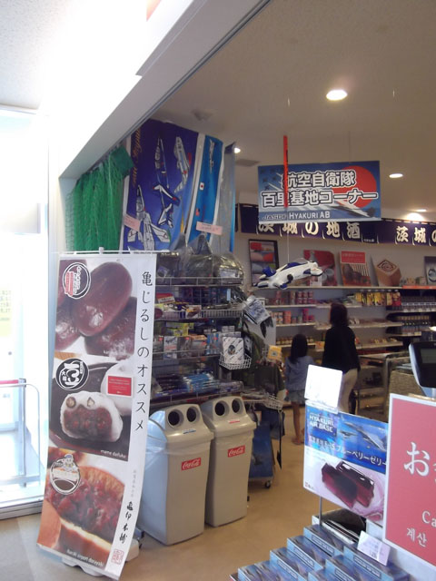 | で、展望デッキから滑走路方向を見ると…、左側がスモークになっていて、見えません。決して、展望デッキの左側がスモークガラスになっているのではなく、展望デッキのどのガラスも、左側を見るとスモークになっているのです!!。 ターミナルビルの左方向に、航空自衛隊百里基地があるから、ですね。 土産物店にも、自衛隊コーナーが…。 |