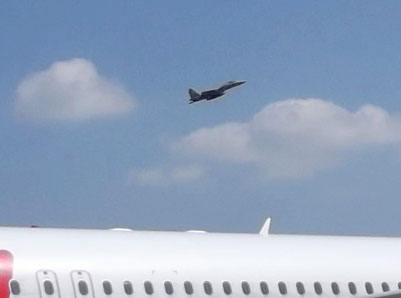 ただ、この空港独特の雰囲気があります。 アシアナの旅客機が着陸した直後から、自衛隊の訓練飛行が再開したのです。おかげで、うるさくて、うるさくて。 しかも、まるで航空ショーのように、低空飛行で訓練をするものだから… 上の写真を拡大してみました。 元空軍パイロットが多いと言われる韓国の旅客機パイロットの前でこんな事をして、アシアナのパイロットに「空軍魂」を思い出させてどうする(^^;;; |