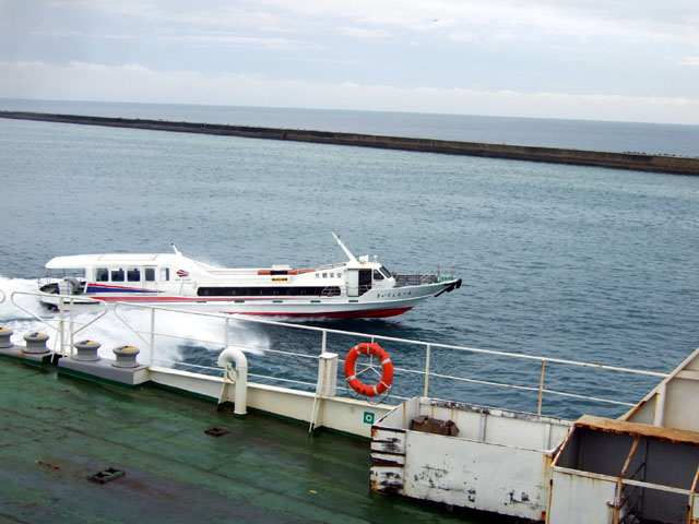 | と、感慨にふけると、まもなく、背後から高速船や高速フェリーが追いかけてきて、この船のすぐ脇を追い抜いていきます。 離島へ向かう船たちですね。 離島ターミナルで見たときよりも、ずいぶん小さく見えます。