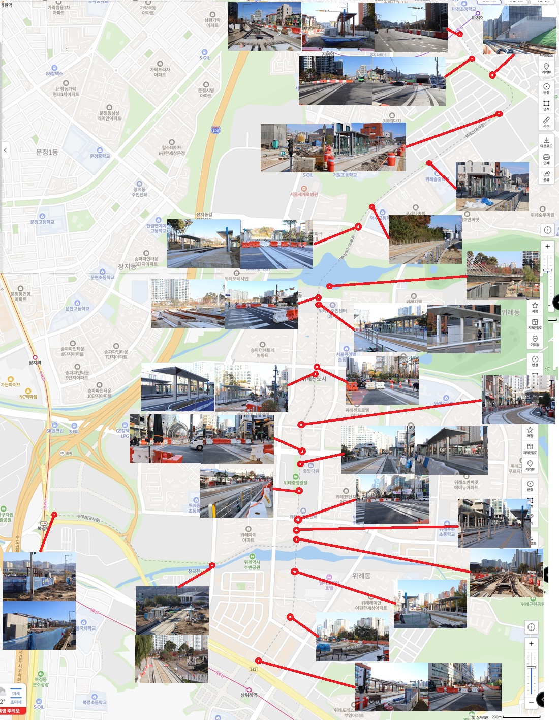 | 2025年11月18日に、ソウル特別市松坡区・城南市寿井区を走るトラム(路面電車)「慰礼(ウィレ)線」の新設工事現場を見てきました。その模様を報告します。 8月の訪問時に比べると、大半の区間で線路が敷いてある、または線路がいつでも敷くことができる状態になっていました。 未工事だった道路との交差区間でも、道床が敷かれ(一部は線路も)、「試運転近し」と思わせるような状況でしたが、馬川駅~車両基地あたりでまだ道床工事中でしたので、早くても試運転は来年の春くらいでしょうか。 2025.8.14の工事状況はこちら。 文字と画像だけで説明しても判りづらいと思うので、地図にまとめてみました。 地図上の写真をクリック(またはタップ)すると、拡大画像が表示されます。 |